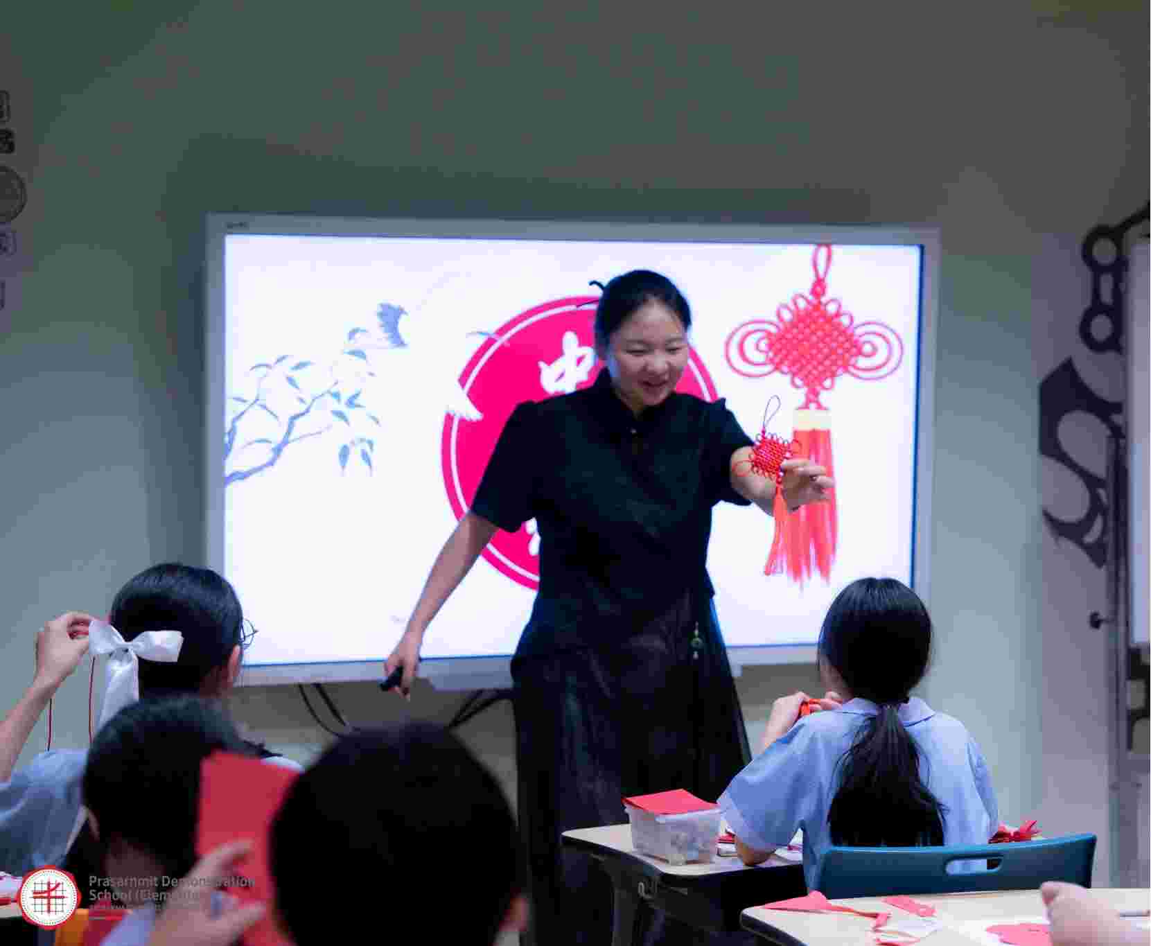 (李沂芳向诗大附小中文班学生展示中国结)