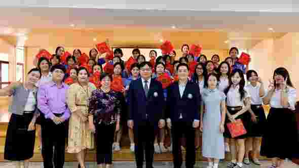 2025年8月28日,玛希隆大学孔子学院中方院长林艳、泰方院长张曹武、泰方副院长王澜鹏及孔院志愿者一行访问泰国百年名校瓦塔娜女子学院(Wattana Wittaya Academy),成功举办以“书写祝福·手作光明”为主题的中文文化交流活动。本次活动不仅是语言教学的延伸,更是中泰教育理念和人文精神的一次深度对话。