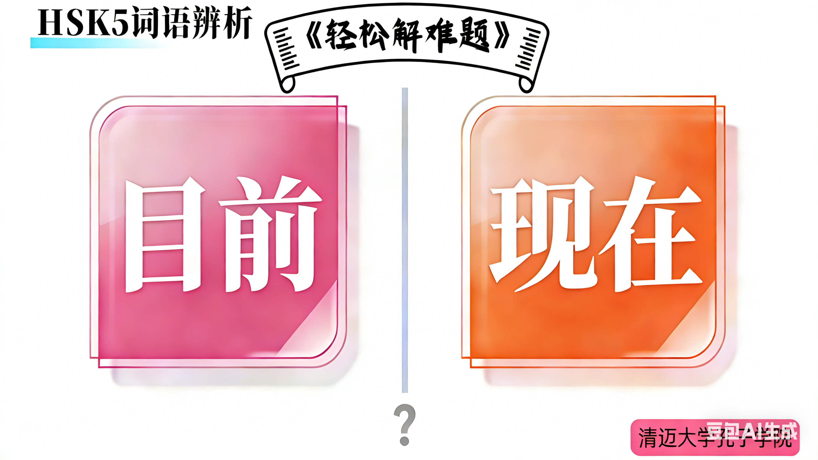 本视频以 HSK5 级易混淆词语 “目前” 和 “现在” 为核心,以两者的语义差异与用法边界为出发点,用清晰的例句对比、场景化用法拆解,帮助汉语学习者精准掌握辨析技巧。课程中,老师通过典型语境举例、语法功能解析,直观呈现 “目前” 的阶段性客观表述属性与 “现在” 的即时性时空指代特点,搭配实用练习场景,让学习者快速区分两者在句式搭配、语义侧重上的不同。视频以简洁易懂的讲解风格,助力 HSK5 级学习者突破词语辨析难点,提升汉语表达的准确性与规范性。