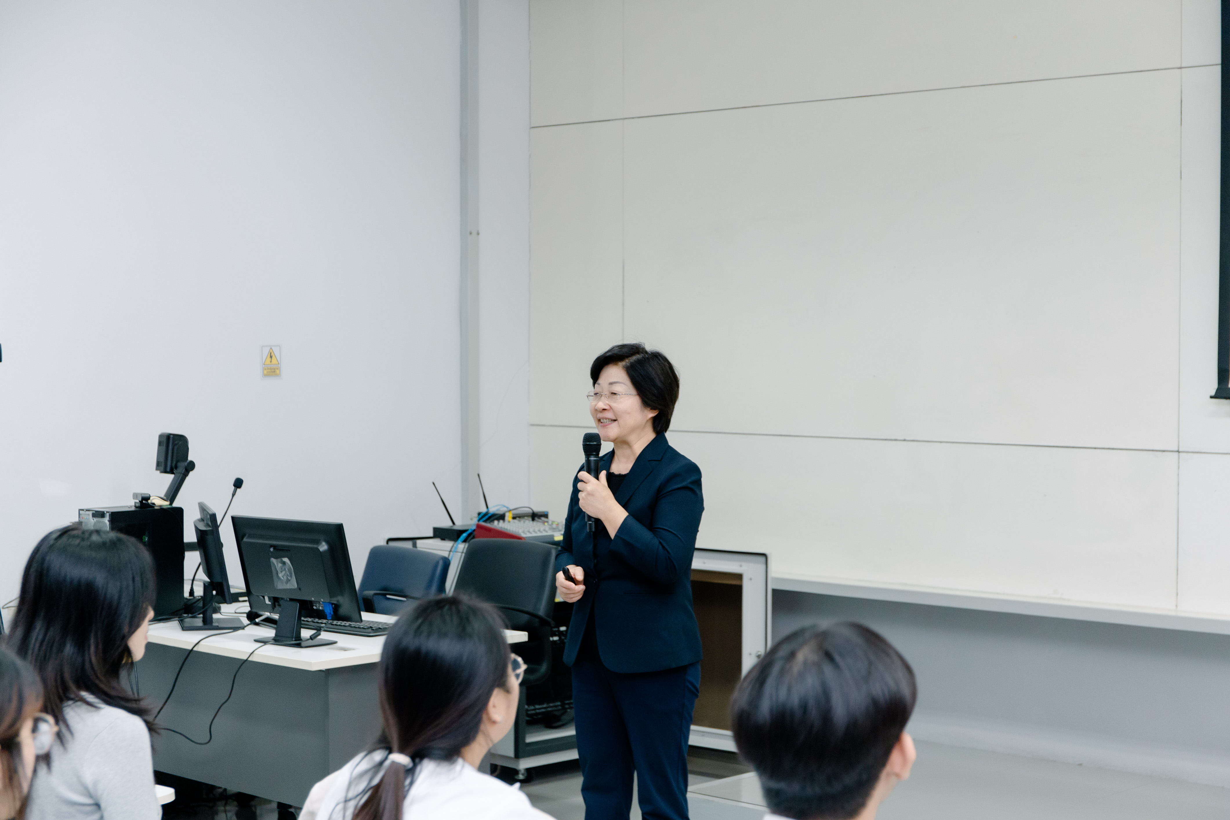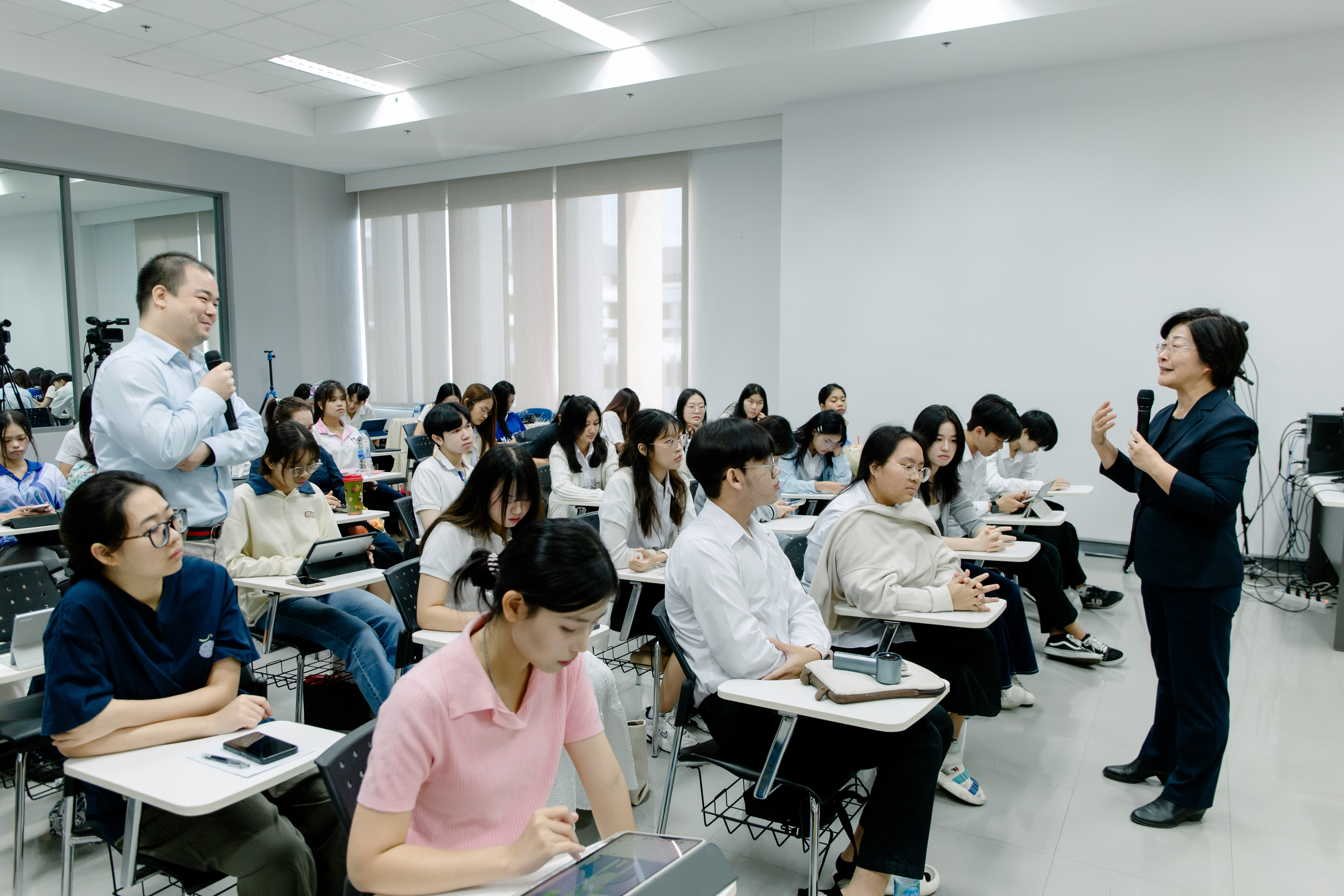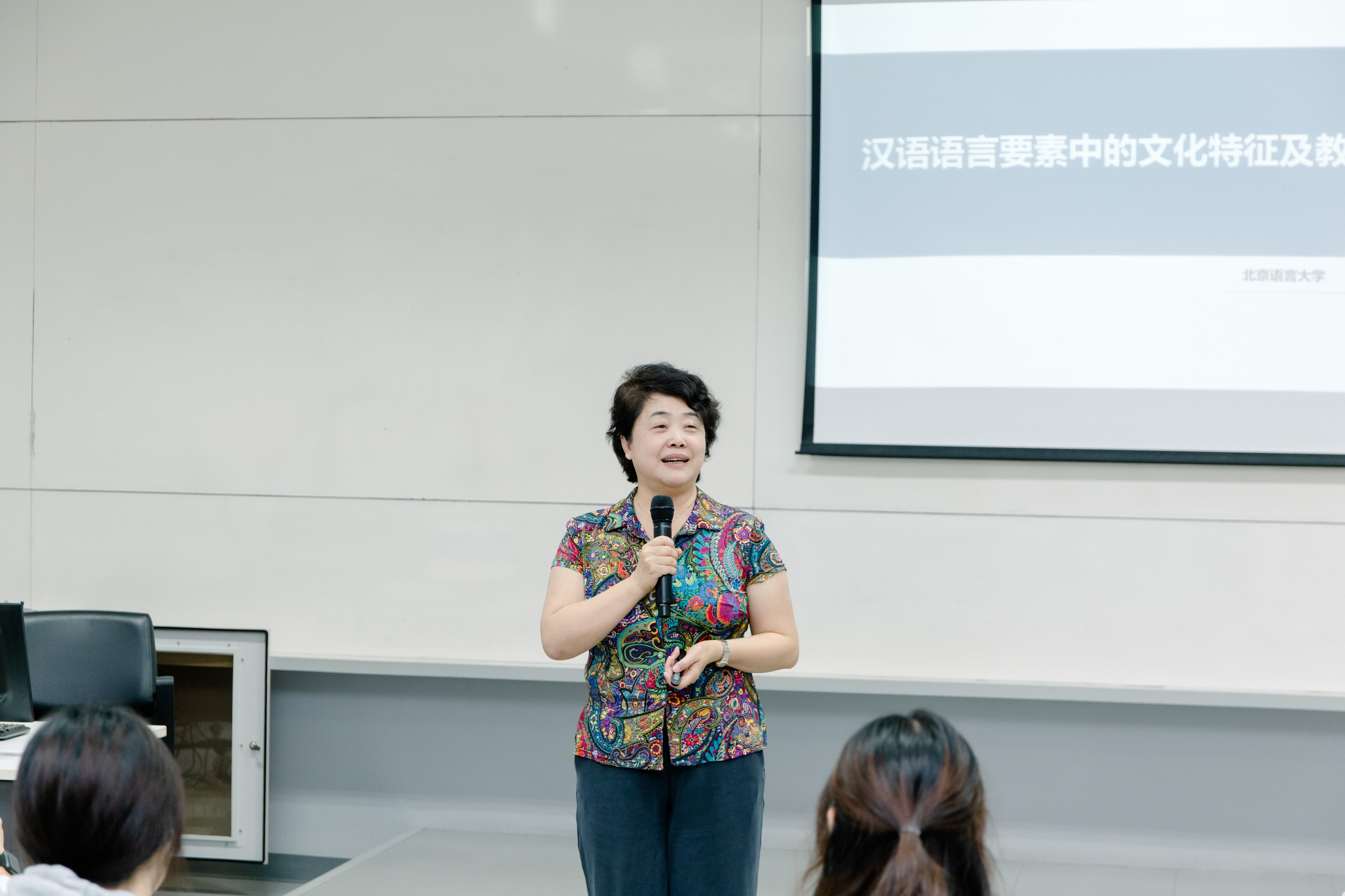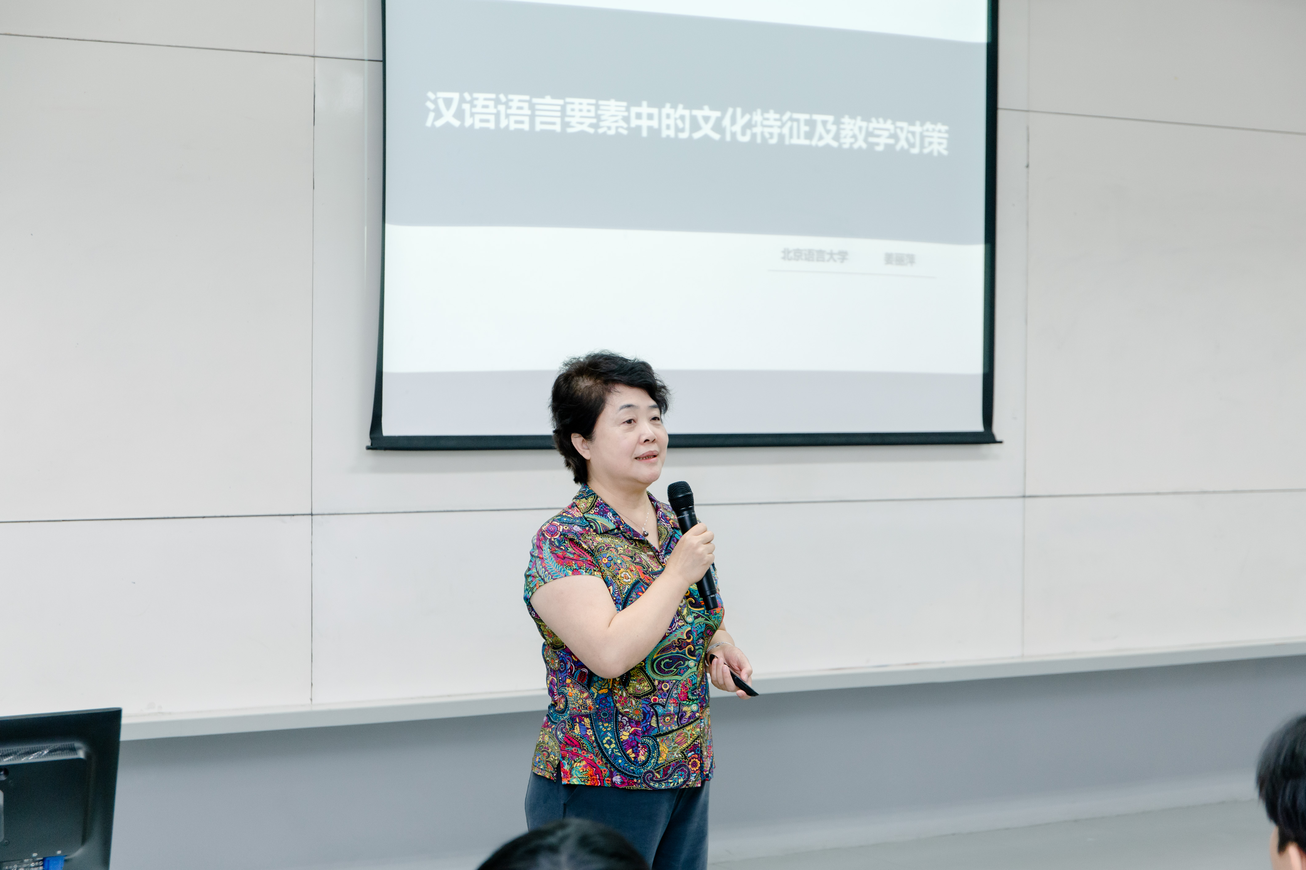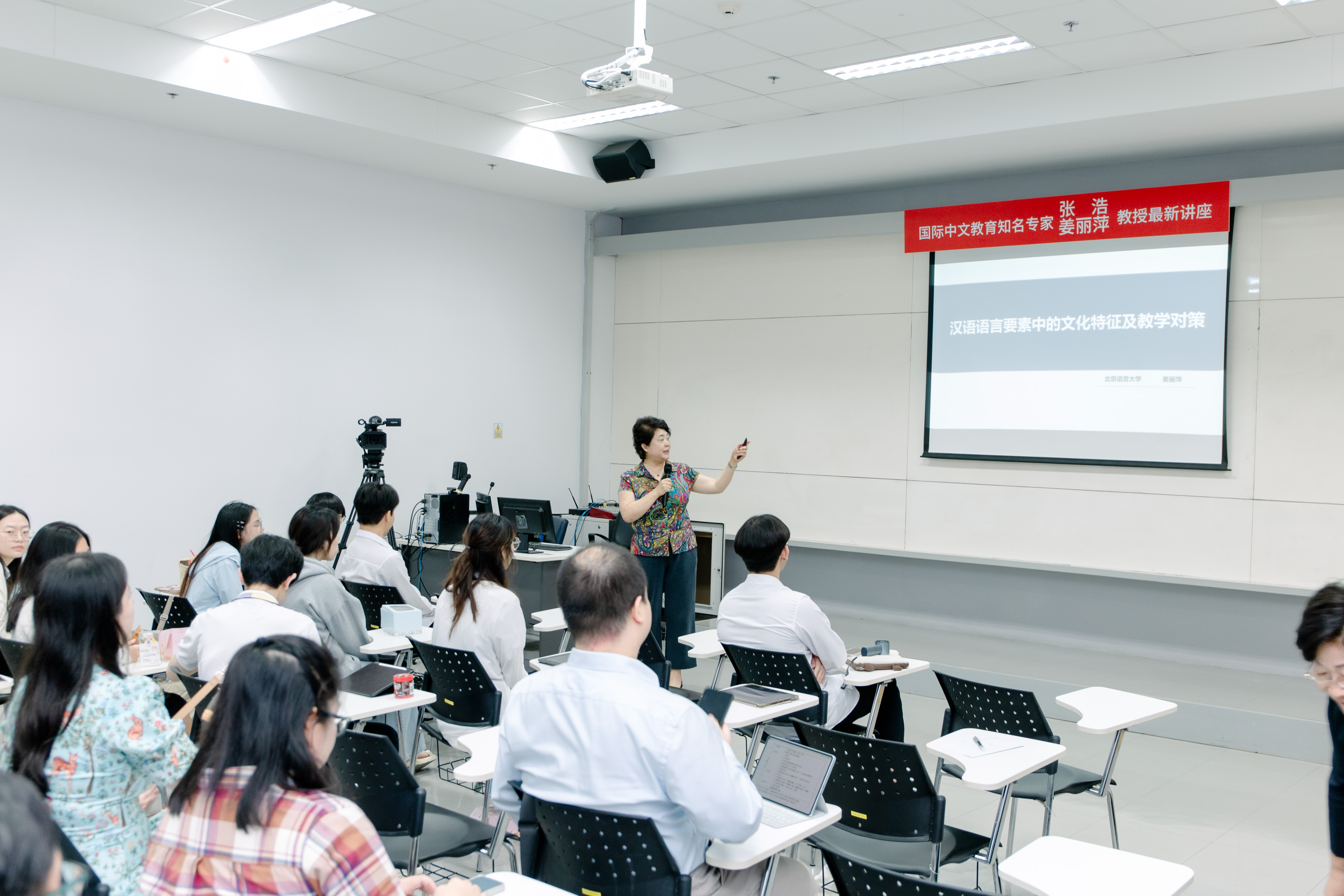 姜丽萍教授以“汉语语言要素中的文化特征及教学对策”为主题进行讲座。姜教授从汉语的语音、词汇、语法和汉字中的文化特征切入,生动有趣地通过解读语言实例、与学生互动问答等方式讲解了汉语中蕴含的文化内涵。在互动环节,姜教授风趣幽默地与学生们展开问答,并通过连线题等形式进一步加深学生对中文文化特征的理解。讲座氛围轻松愉快,深受在场听众的喜爱。
