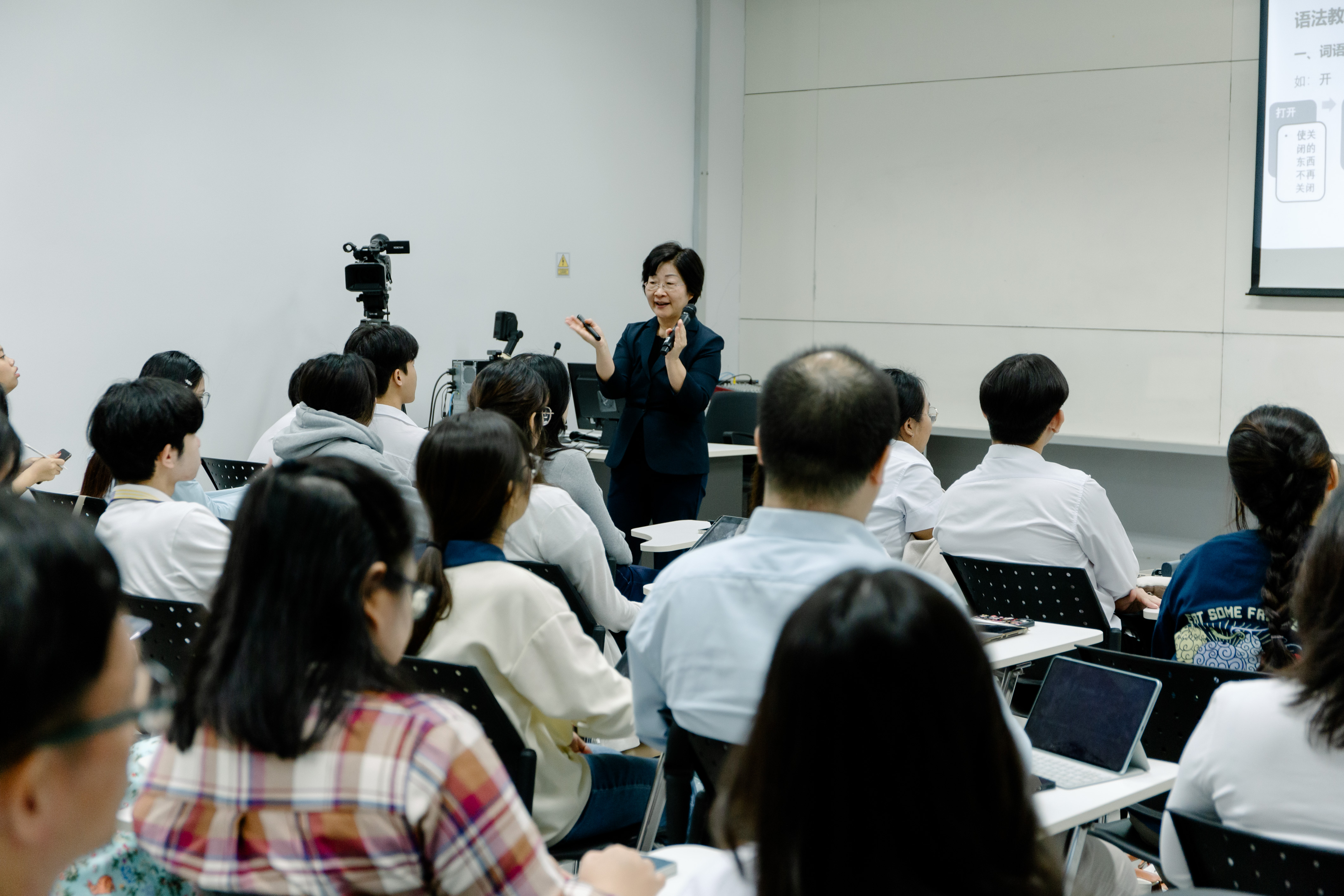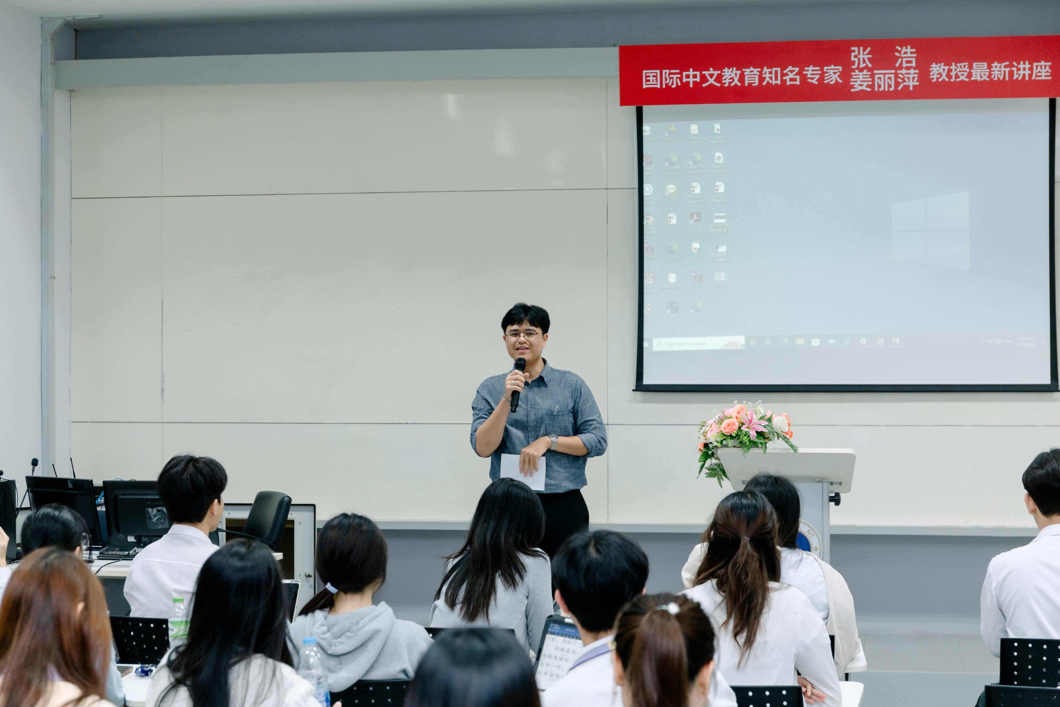 讲座正式开始后,张浩教授以“国际中文语法教学设计和案例分析”为主题进行了讲座。他从语法教学的原则、教学设计及具体案例分析三个方面入手,从语源学的视角对语法教学进行剖析。张浩教授结合多个实际教学案例,详细阐述了语法教学设计的原则,并通过形式、意义和语用三个方面对教学方法进行了深刻讲解。讲座互动环节精彩纷呈,张浩教授与现场师生进行了积极的交流和互动,学生们踊跃提问,张教授耐心细致地解答了同学们关于语言本体和毕业论文写作方向的问题,现场氛围热烈。