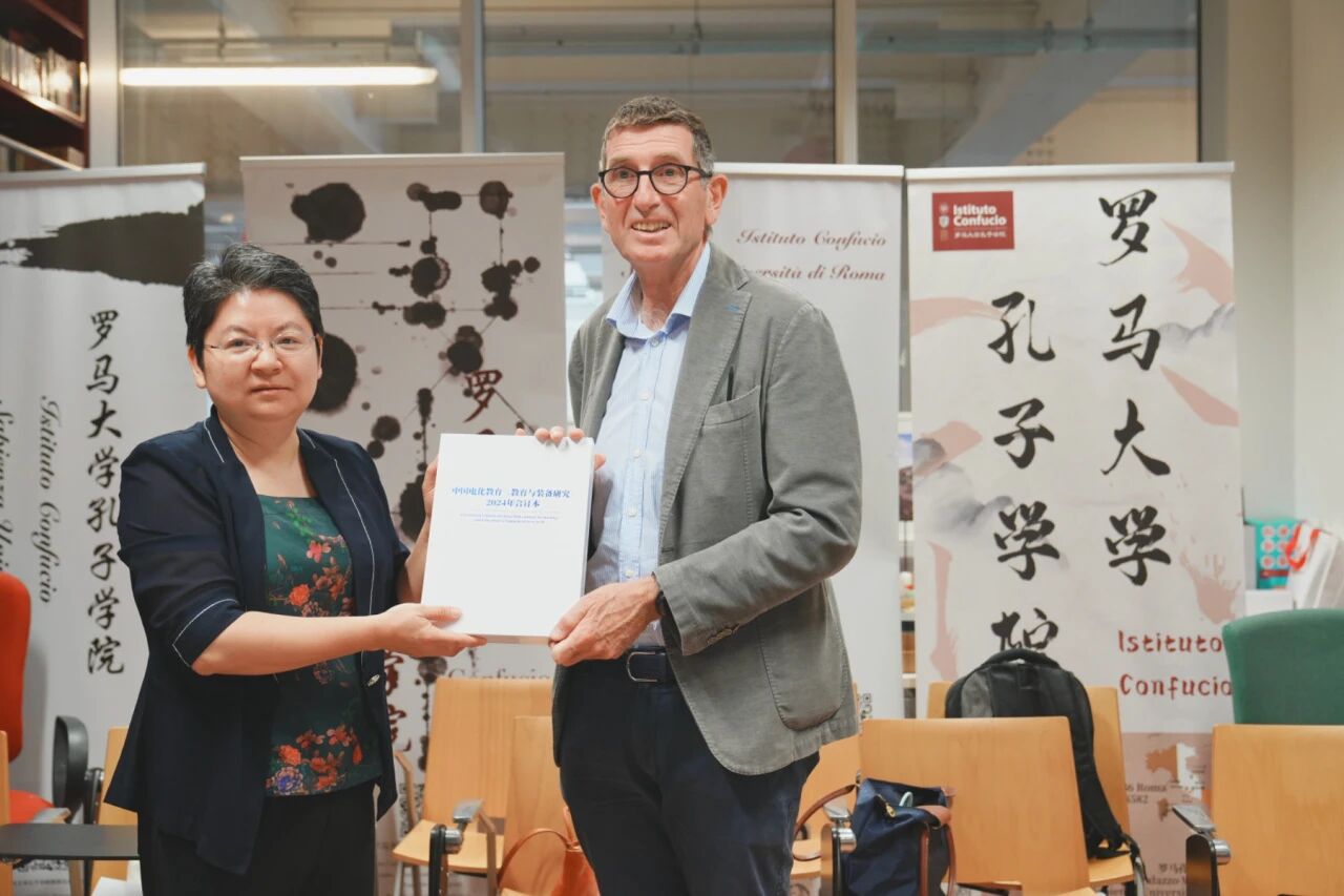在友好而热烈的氛围中,双方互赠纪念品并合影留念。本次交流不仅加深了教育部资源中心代表团对罗马孔院办学成果的了解,也为未来在教育数字化及国际合作方面的进一步探索奠定了基础。