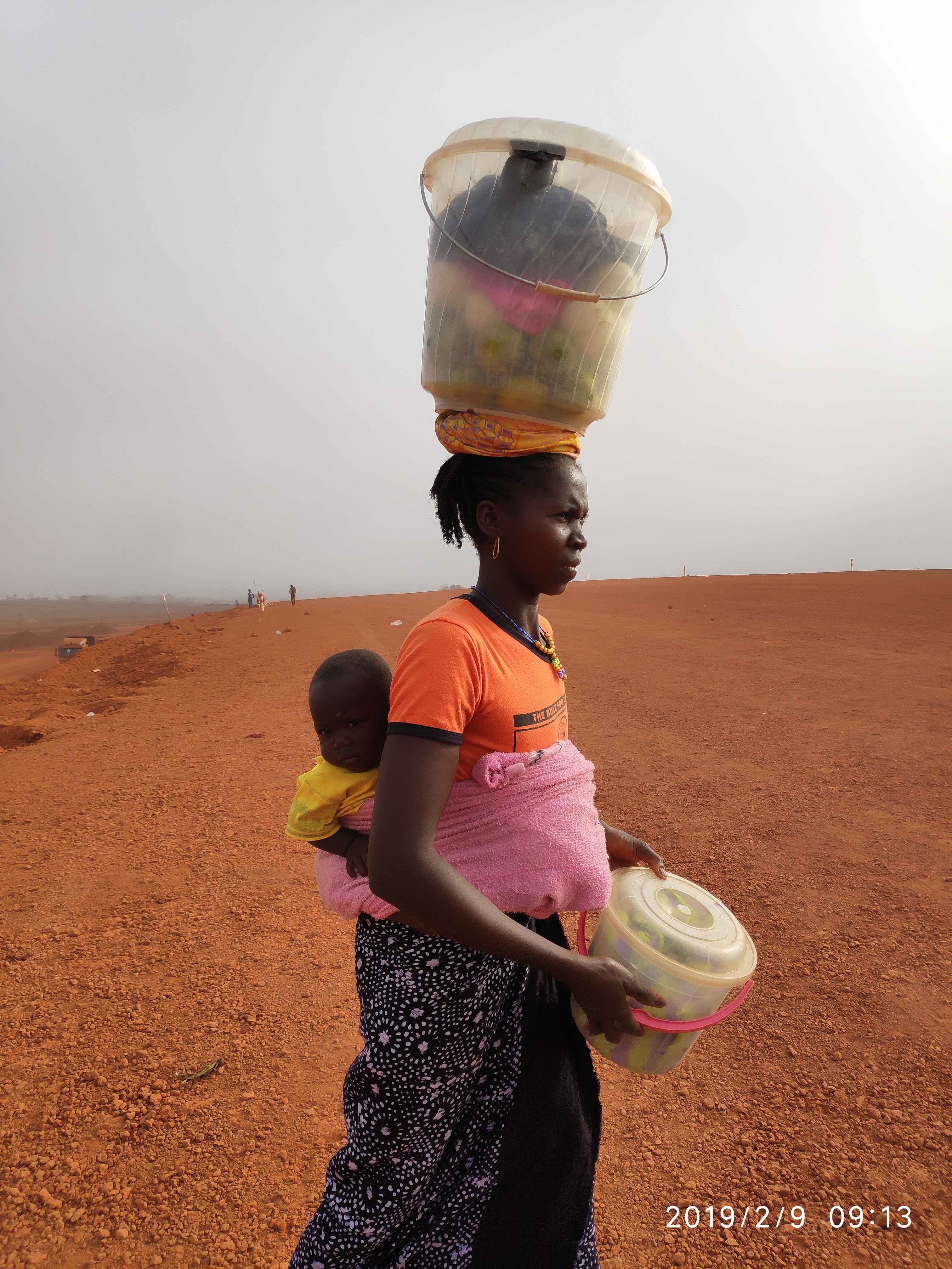几内亚有很多的中资公司在偏僻的深山采矿,附近的村民会到工地上卖水果或者食物,他们或许从来没有走出过村子,采摘自家的水果到工地上售卖,维系自己最基本的生活,背着孩子,手里拿着桶,头上顶着一桶橘子,生活的负重并没有压垮她,在这种条件下努力的生存并且生活下去。