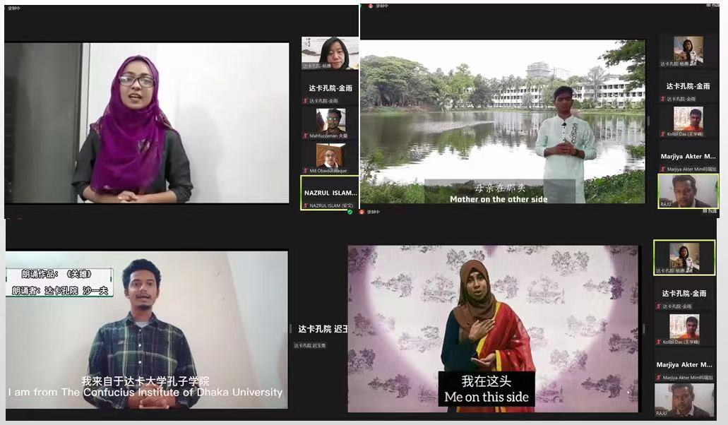 2022年4月20日,由中国驻孟加拉国大使馆主办,达卡大学孔子学院承办的“2022年国际中文日”中华经典诵读分享会成功举办。达卡大学孔子学院的同学和孟加拉国的中国诗歌爱好者在线朗诵了他们喜爱的中国诗歌,并分享了他们诵读后的感受。中国驻孟加拉国大使馆文化处二秘郎琅女士、达卡大学现代语言学院中文系主任阿弗扎尔·侯赛因副教授、达卡大学孔子学院中方院长杨惠博士以及达卡大学孔子学院的师生们参与了诵读分享活动。