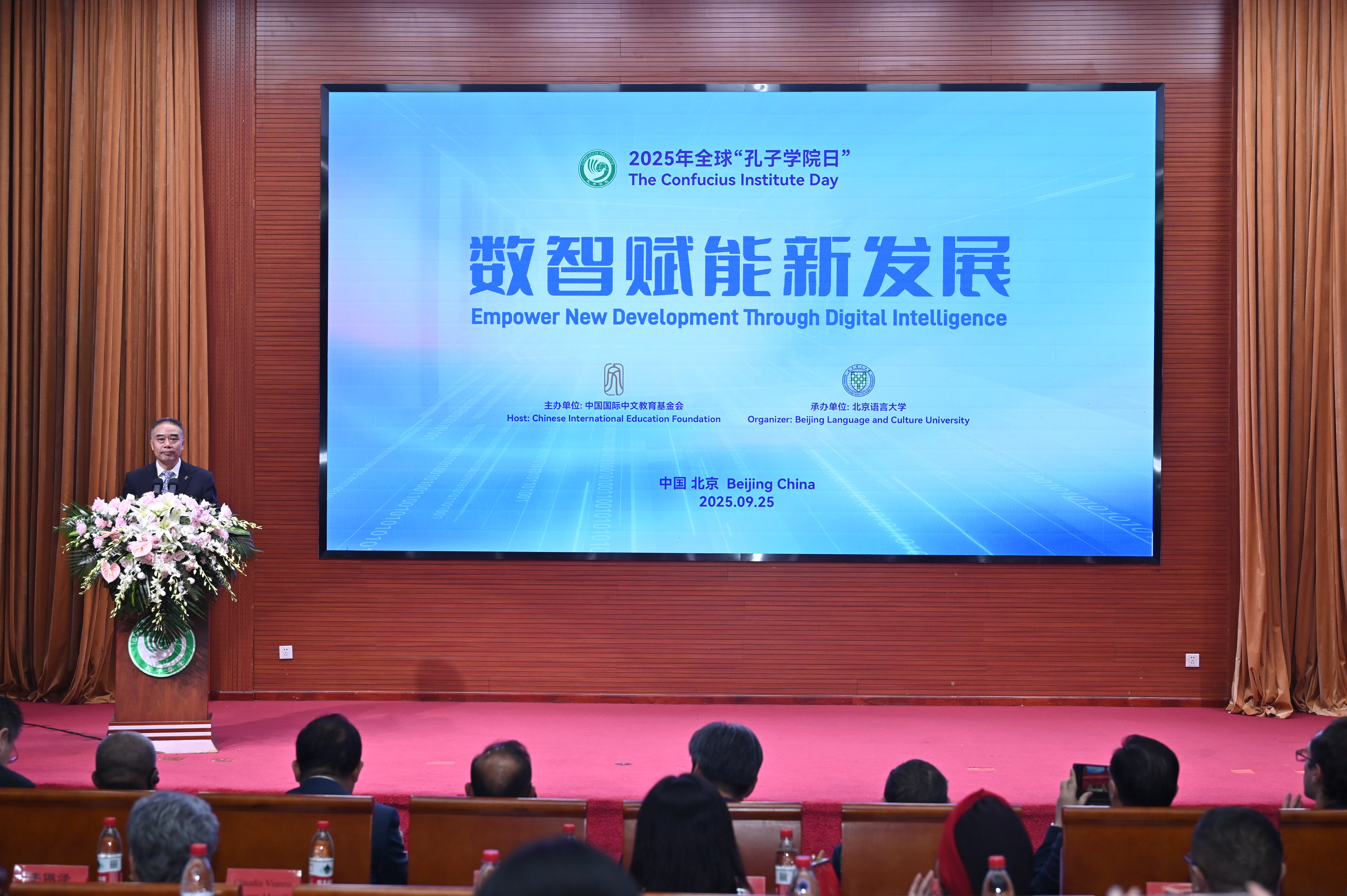 9月25日,2025年全球“孔子学院日”活动在京成功举办。本次活动由中国国际中文教育基金会主办、北京语言大学承办,主题为“数智赋能新发展”。阿尔及利亚驻华大使卡伊德·苏莱曼·拉赫桑,孟加拉国驻华大使馆公使衔参赞、副馆长卡齐·习奥·哈桑,马达加斯加驻华大使馆公使衔参赞桑巴尼亚纳·维克托等驻华使节,中国政府部门代表,孔子学院院长、中外方合作机构代表等中外来宾齐聚一堂。活动由中国国际中文教育基金会副理事长、秘书长赵灵山主持。