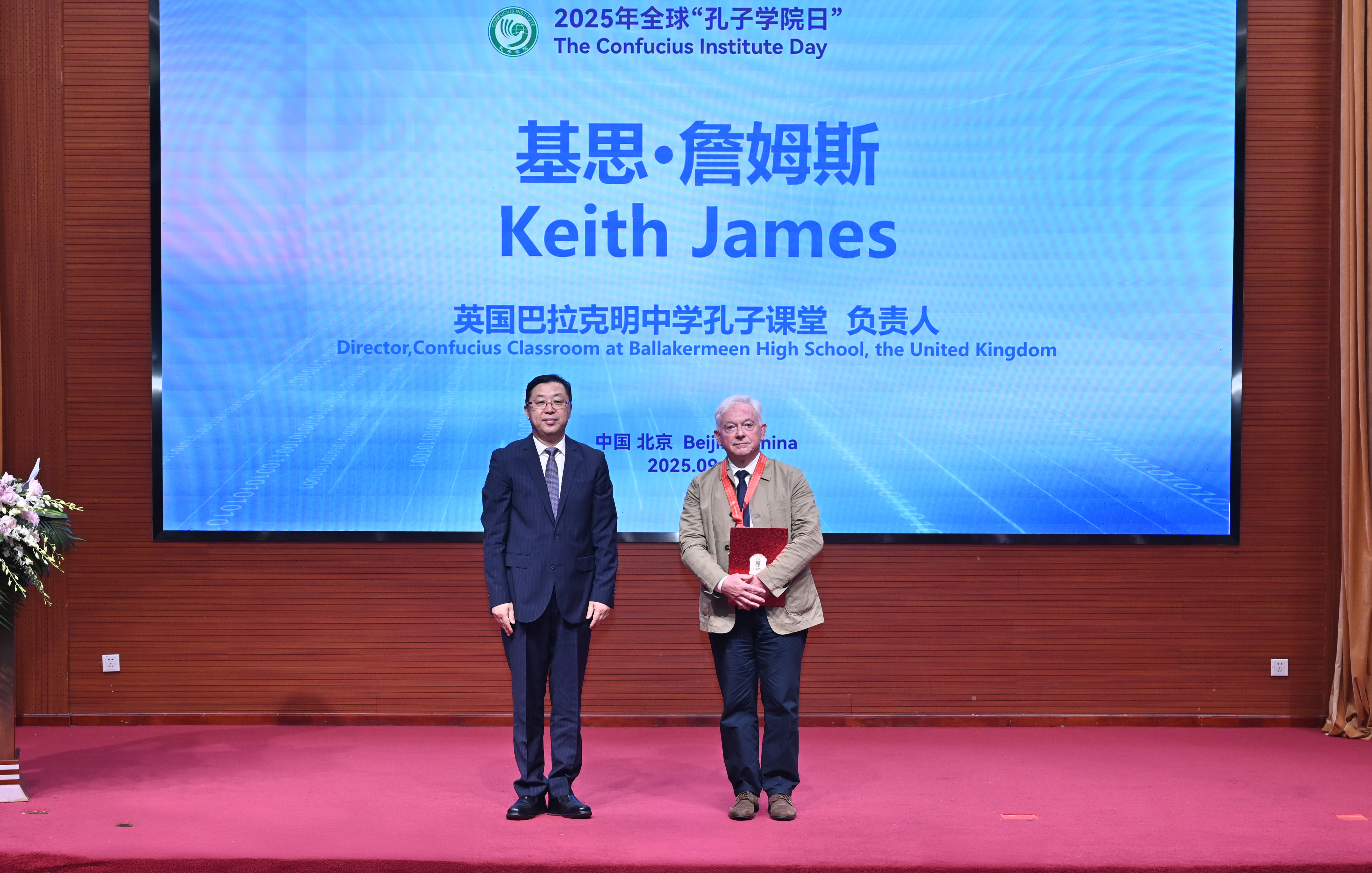 英国巴拉克明中学孔子课堂外方负责人、前副校长基思·詹姆斯代表孔子学院院长纪念奖章获得者发言,他分享了巴拉克明中学孔子课堂在数智教学方面的实践与成效,通过打造“随时随地可访问”的在线课程体系,持续优化数字化教学策略,孔子课堂的教学成果有了显著的提升。