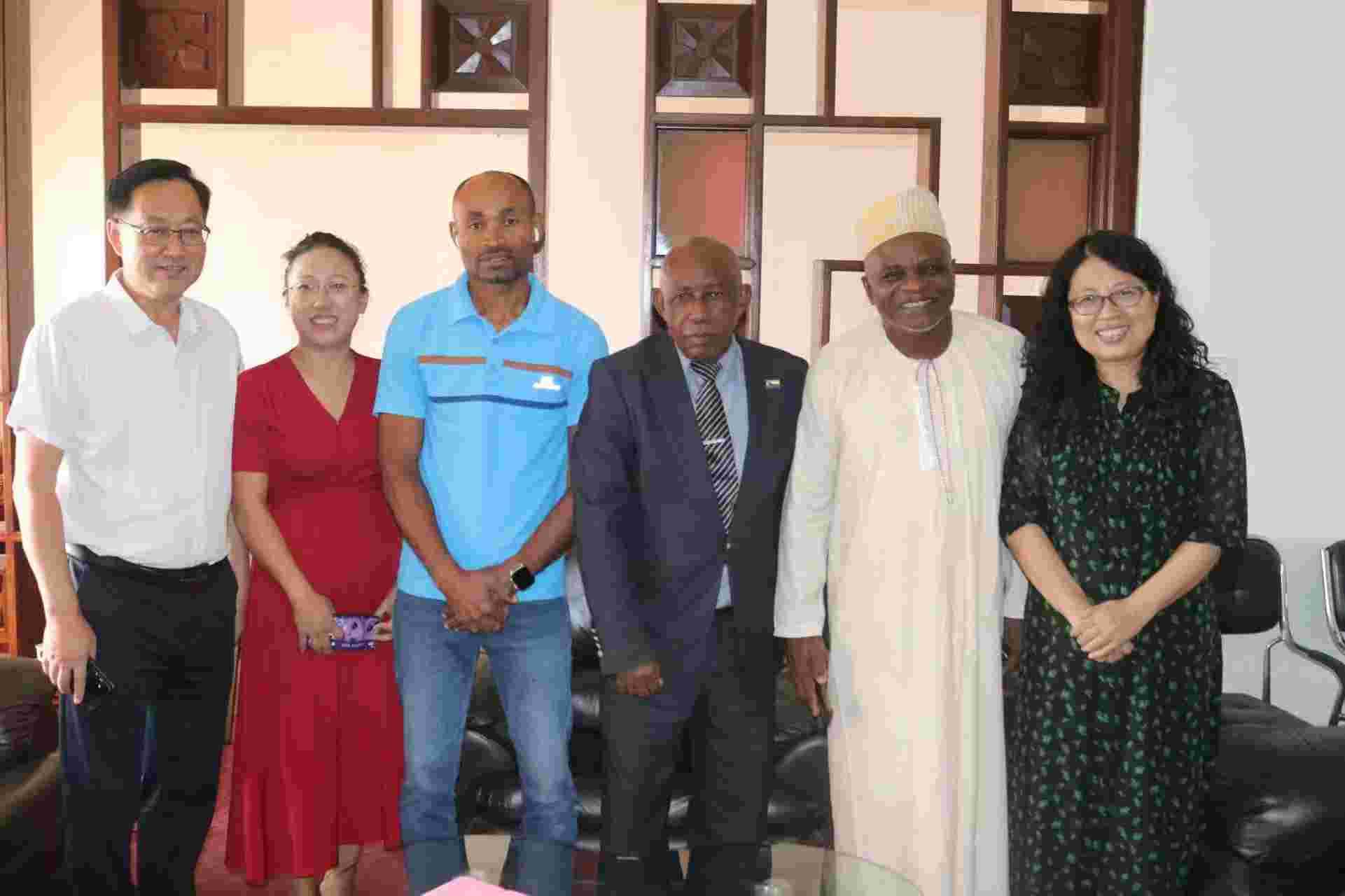 2025年8月11日,科摩罗大学孔子学院新任中方院长王克与即将离任的中方院长张茂庆,在孔院科方院长阿兰的陪同下,拜见科摩罗大学校长塔碧布,并就孔院发展、两校合作及中科文化交流等事宜展开深入交流。