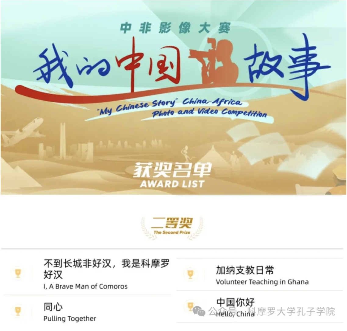 2024年9月,由中非合作论坛后续行动委员会秘书处、中国公共外交协会主办的“我的中国故事”中非影像大赛获奖作品正式揭晓。比赛收到来自全球58个国家和地区的800余位创作者的2600余部作品,经过大众投票、专家评审等环节的综合评选,科摩罗大学孔子学院学员慕斯丁的作品《不到长城非好汉,我是科摩罗好汉》脱颖而出,荣获大赛二等奖。