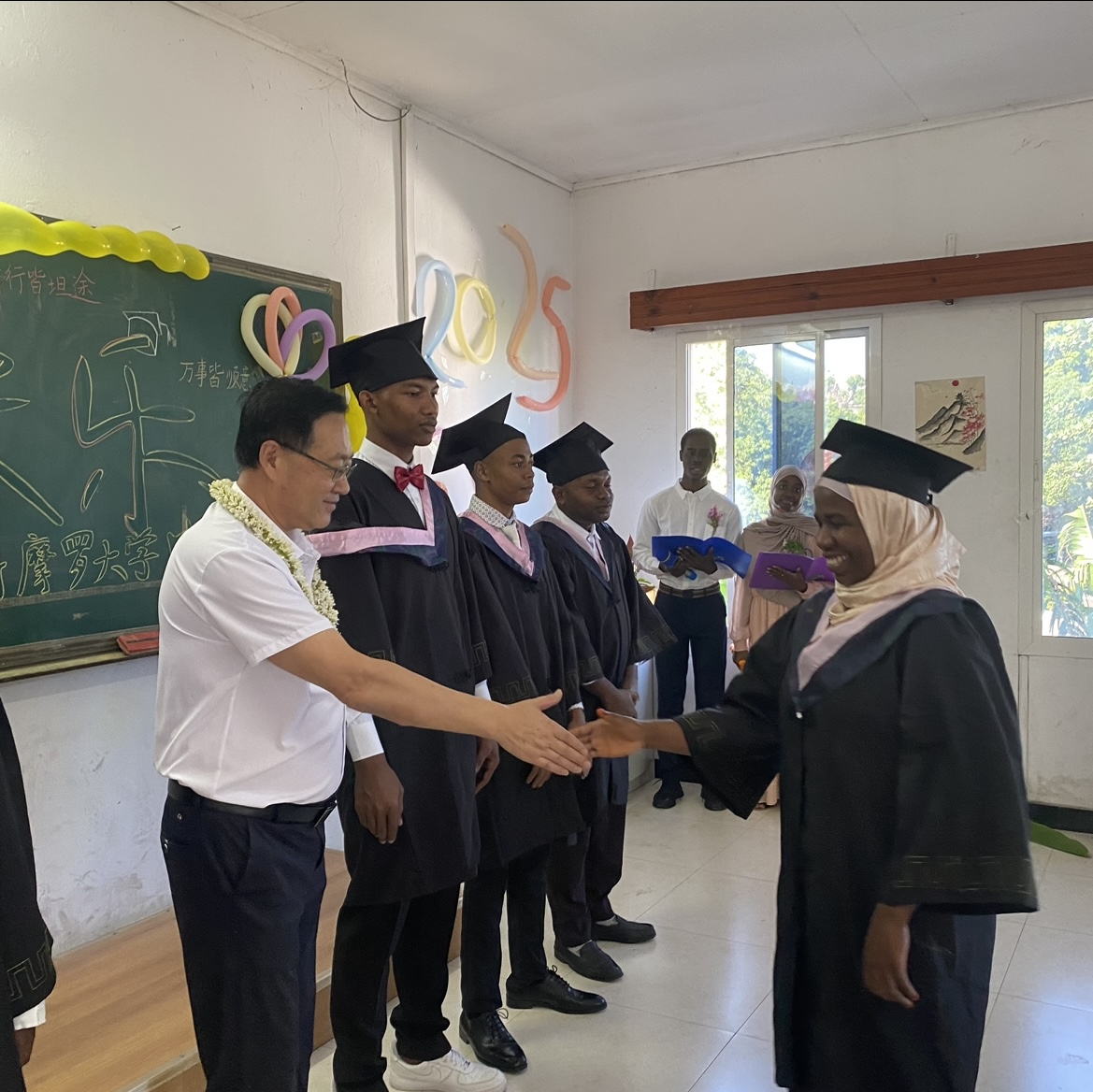 当地时间2025年6月27日上午9点,科摩罗大学孔子学院与大学合作成立的中文系在孔子学院驻地cufop举行2025届毕业典礼。科摩罗大学中文系全体师生、2025届毕业生家长和朋友,共一百余人参加。