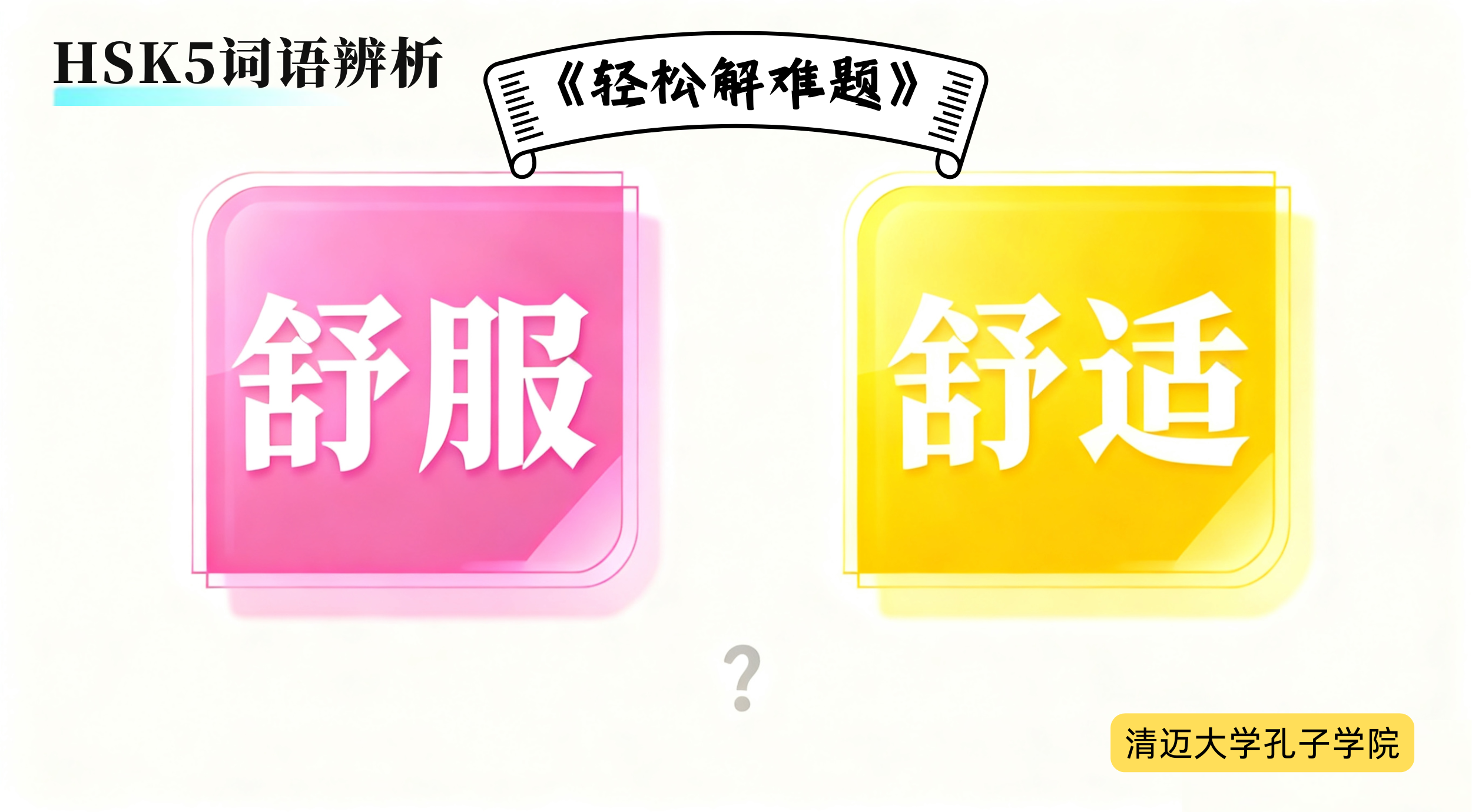 本视频聚焦 HSK5 级核心近义词“舒服”与“舒适”,为汉语学习者系统解析二者差异。两个词语均为形容词,核心含义均为“让人感觉轻松愉快”,日常使用中常可互换。视频从三方面展开辨析:一是使用场景,“舒适” 多用于书面语,“舒服” 更偏向口语表达;二是适用对象,“舒适” 侧重描述环境带来的整体感受,“舒服”可用于表达个人想法与主观感觉;三是语法功能,“舒服”可通过 AABB 式重叠(如 “舒舒服服”)或 ABAB 式活用为动词,“舒适”无此类用法。